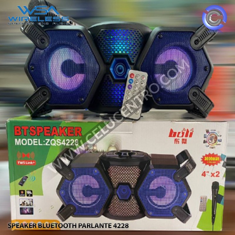 El parlante S4228 uenta con una bateria de 1200MAH con una duracion de hasta 9 horas continuas de uso con un alto parlante de 5V de salida con funcion de radio,conexion bluetooth para dispositivos IOS y Android, slot para usb y memoria sd, cuenta con un diseño sencill y pequeño que le permite ser transportado de manera facil con una correa para sujetarlo , incluye cargador y manual de instrucciones.