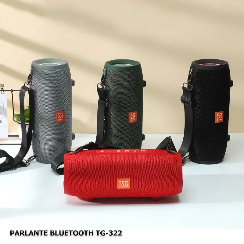 El parlante T&G TG 322 cuenta con una bateria de 1000MAH con una duracion de hasta 3 – 4 horas continuas de uso con un alto parlante de 5V de salida con funcion de radio, conexion bluetooth para dispositivos IOS y Android, slot para usb y memoria sd, cuenta con un diseño sencill y pequeño que le permite ser transportado de manera facil con una correa para sujetarlo , incluye cargador y manual de instrucciones Tamaño: 28*11*12cm​